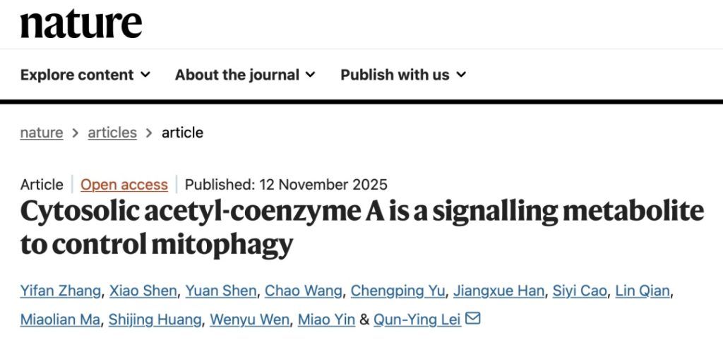 ①Cytosolic acetyl-coenzyme A is a signalling metabolite to control mitophagy. Nature (2025). https://doi.org/10.1038/s41586-025-09745-x